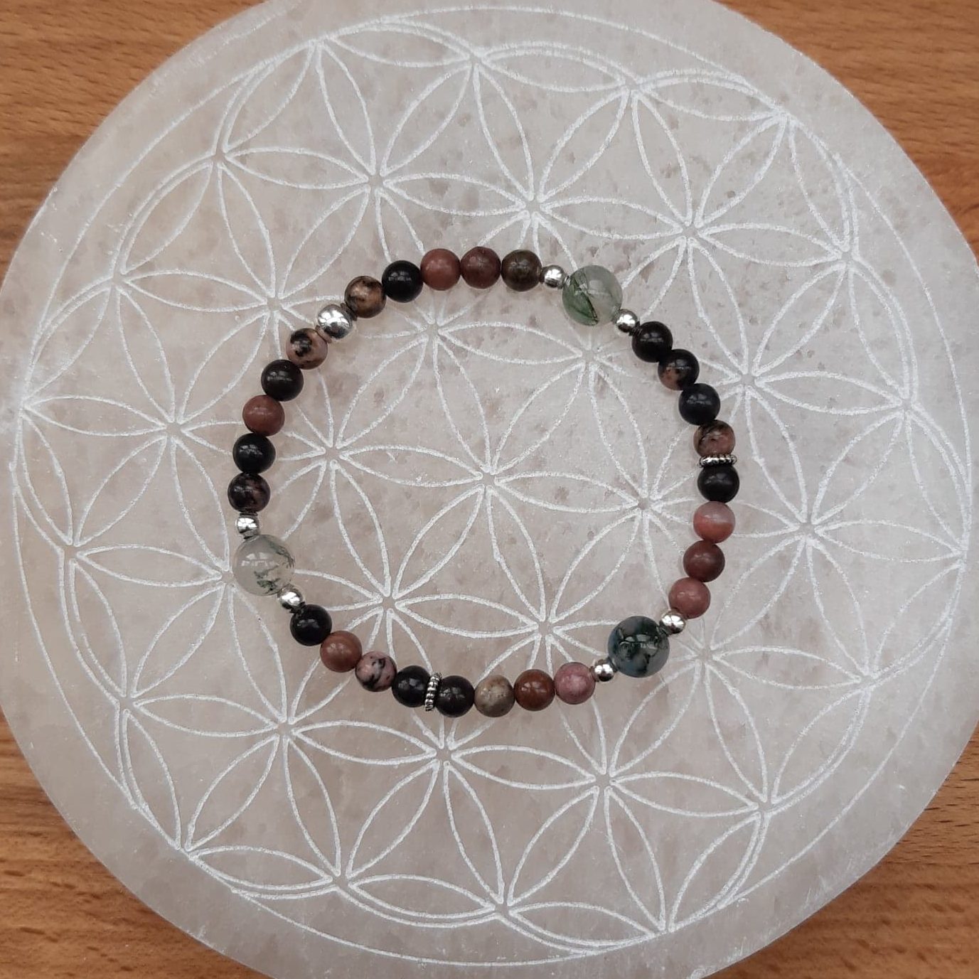 Avec la rhodonite, pierre de l’amour, apaise les craintes, angoisses et trop-plein émotionnels. En pansant les blessures émotionnelles, elle favorise les relations affectueuses et ouvre le chakra du cœur. Elle est une bonne béquille dans les périodes de changements et de conflits. Elle renforce le système immunitaire et régule le rythme cardiaque.